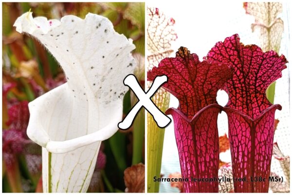 Questi semi derivano dall’incrocio tra 2 eccellenti cloni di Sarracenia leucophylla estremamente diversi tra loro: uno è forse quello con la colorazione bianca più pura in assoluto, in cui le venature scompaiono su tutta la parte alta dell’ascidio, e l’altro ha ascidi rossi a dir poco spettacolari, con fenestrature magenta e venature scure che arrivano al nero.