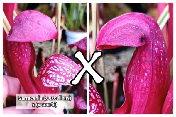 I semi derivano da autoimpollinazione di Sarracenia x “EG purple dome”, che è un clone selezionato targato Esotik Garden con portamento semi-prostrato dell’ibrido complesso S. (x excellens) x (x courtii). Questo clone presenta degli opercoli molto grandi a forma di cupola perfettamente emisferica che sovrastano completamente l’apertura della trappola. La colorazione è purpurea, con alcune macchioline bianche.
