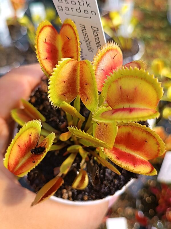 ALIMENTAZIONE E CONCIMAZIONE: Quando viene coltivata all’aperto, Dionaea muscipula cattura prede in abbondanza e non necessita di alcun aiuto. È comunque possibile integrare la sua dieta con un fertilizzante fogliare da applicare una volta al mese. Generalmente va bene usare 1/10 del dosaggio raccomandato in etichetta di un qualsiasi concime universale con microelementi. Se desideri nutrire le trappole della tua acchiappamosche, ti consigliamo di utilizzare prede vive, poiché le trappole, una volta scattate, hanno bisogno di sentire ulteriore movimento al loro interno per sigillarsi ed iniziare il processo di digestione. Ogni scatto a vuoto (o per cibo inerte) significa una grande quantità di energia sprecata per la pianta.