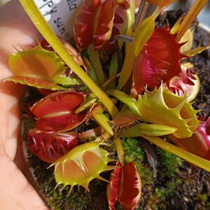 Dionaea muscipula “crispy sun” è un clone molto colorato coi denti fusi. In primavera fa trappole, sorrette da lunghi piccioli eretti, in cui la dentatura caratteristica di questo clone è poco pronunciata, mentre in autunno assume un aspetto prostrato con piccioli più corti e trappole in cui la dentatura fusa e rossa è ben evidente.