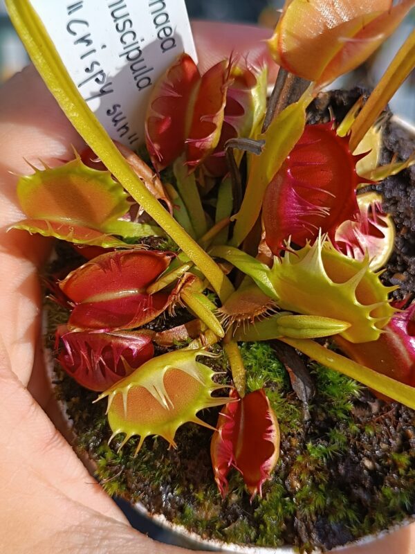 Dionaea muscipula “crispy sun” è un clone molto colorato coi denti fusi. In primavera fa trappole, sorrette da lunghi piccioli eretti, in cui la dentatura caratteristica di questo clone è spesso assente, mentre in autunno assume un aspetto prostrato con piccioli più corti e trappole in cui la dentatura fusa e rossa è ben evidente.