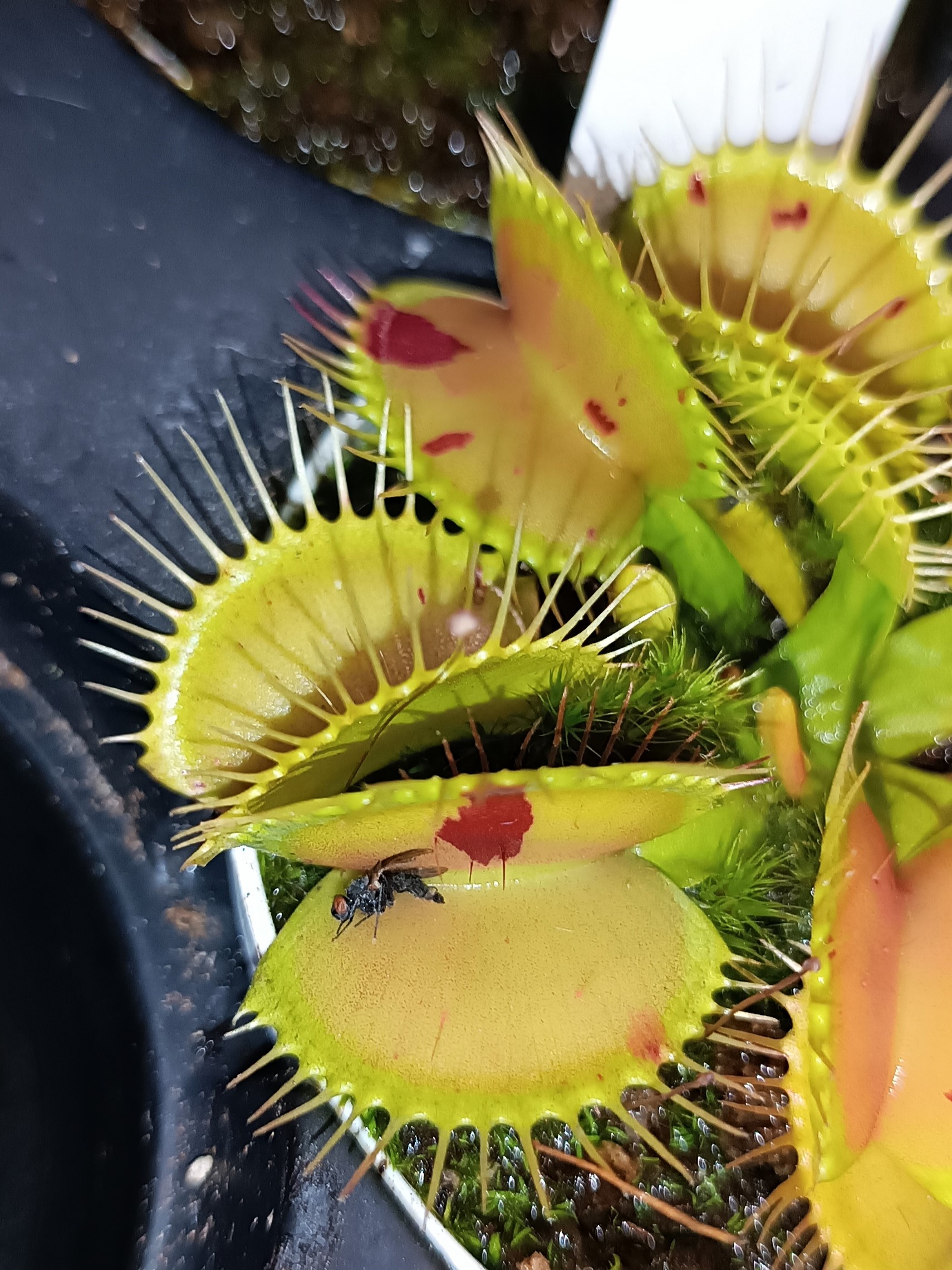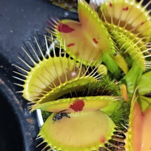 ALIMENTAZIONE E CONCIMAZIONE: Quando viene coltivata all’aperto, Dionaea muscipula cattura prede in abbondanza e non necessita di alcun aiuto. È comunque possibile integrare la sua dieta con un fertilizzante fogliare da applicare una volta al mese. Generalmente va bene usare 1/10 del dosaggio raccomandato in etichetta di un qualsiasi concime universale con microelementi. Se desideri nutrire le trappole della tua acchiappamosche, ti consigliamo di utilizzare prede vive, poiché le trappole, una volta scattate, hanno bisogno di sentire ulteriore movimento al loro interno per sigillarsi ed iniziare il processo di digestione. Ogni scatto a vuoto (o per cibo inerte) significa una grande quantità di energia sprecata per la pianta.