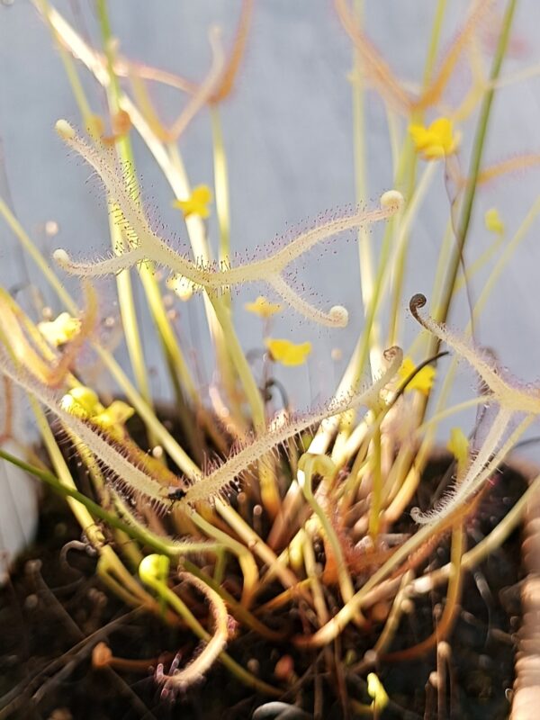 Drosera binata ‘Ghost’ è una selezione con colorazione unica: le foglie e i piccioli si presentano bianchi, gialli o di un verde molto tenue. Un’aggiunta imperdibile in collezione!
