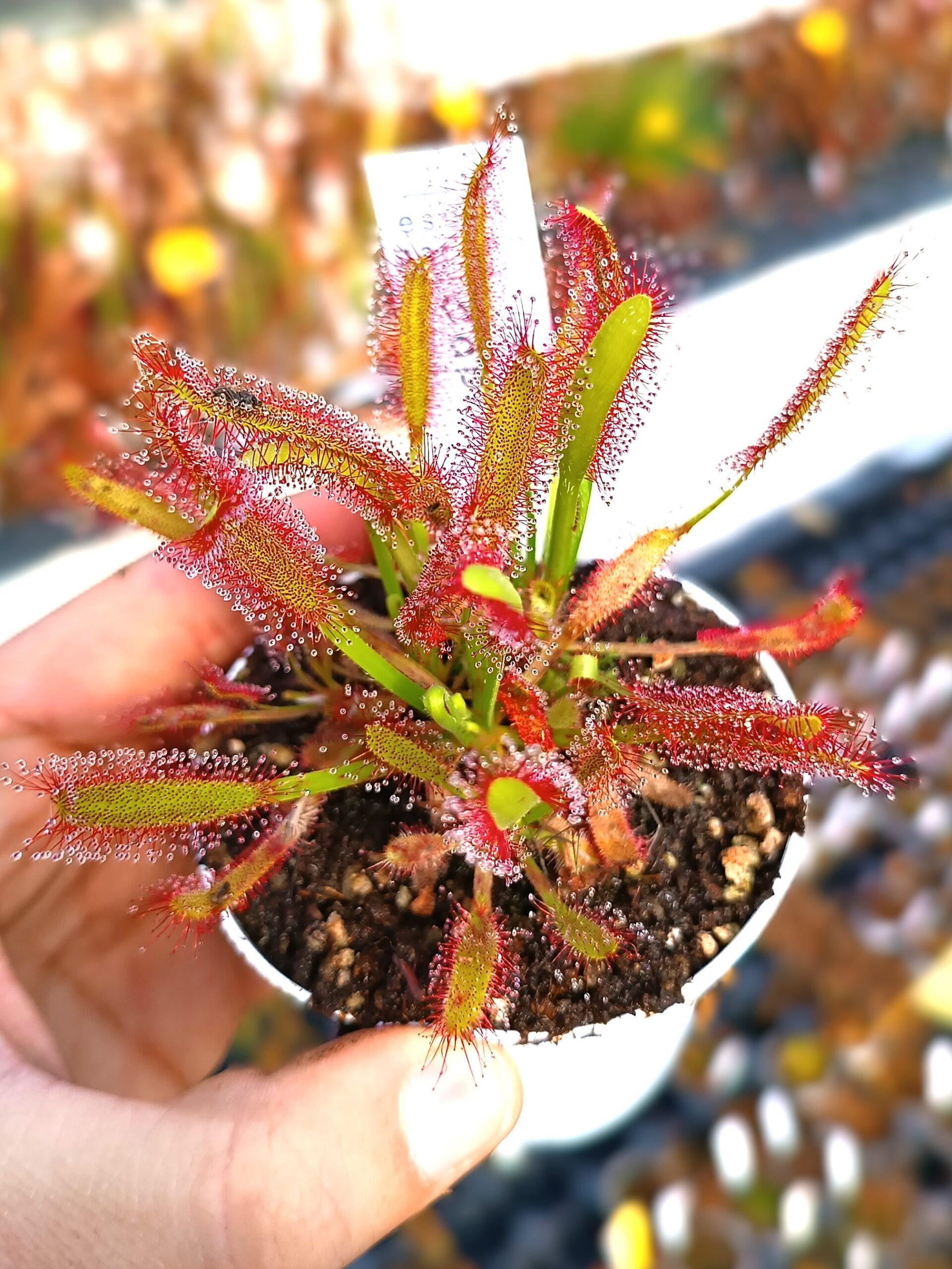 SOLE: sole pieno o mezz’ombra. La maggior parte delle specie di Drosera richiede almeno 4 ore di luce diretta per prosperare. Se la tua Drosera non produce colla, molto probabilmente ha bisogno di più luce.