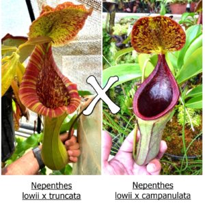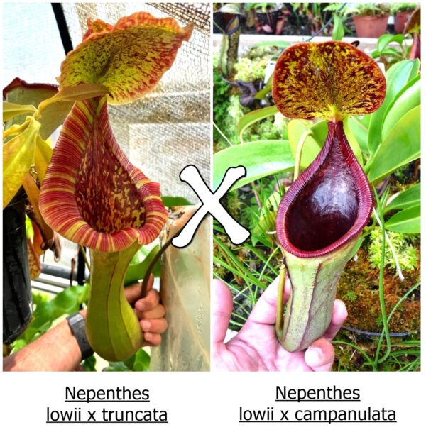 Nepenthes (lowii x truncata) x (lowii x campanulata) è un ibrido complesso di quota intermedia che mescola la forma estremamente inusuale con bocca super allargata di N. lowii e N. campanulata con le grandi dimensioni, robustezza e facilità di coltivazione di N. truncata. Il tutto intrecciando genetiche di alta e di bassa quota per ottenere un ibrido che risulta estremamente adattabile e spettacolare!