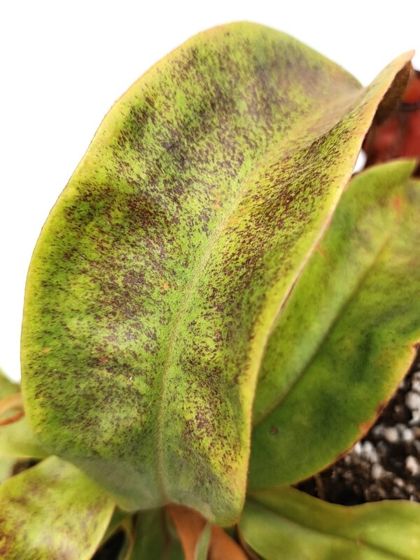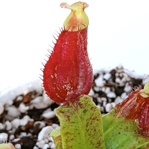 Nepenthes (“Viking” x ampullaria “black miracle”) x (x hookeriana) è un ibrido complesso di bassa quota che presenta ascidi tondeggianti rossi con peristoma a bande più chiare e più scure, nonché interessanti macchie (o spottature) viola sulle foglie. Veramente molto bello.