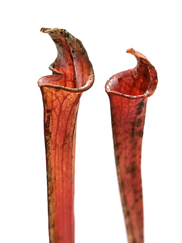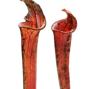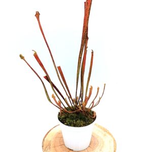 Sarracenia flava “lidless” [var. rubricorpora ‘Claret’ (F25 MK) × “lidless giant”] è la versione senza cappello della specie di Sarracenia che normalmente ha i cappelli più grandi di tutte. Gli ascidi, visti dall’alto, sembrano degli uccellini coi becchi spalancati che aspettano di essere imboccati dalla madre. La genetica di questo incrocio è molto interessante, e gli esemplari in vendita mostrano una colorazione stupenda quasi completamente rossa, nonché dimensioni di tutto rispetto.