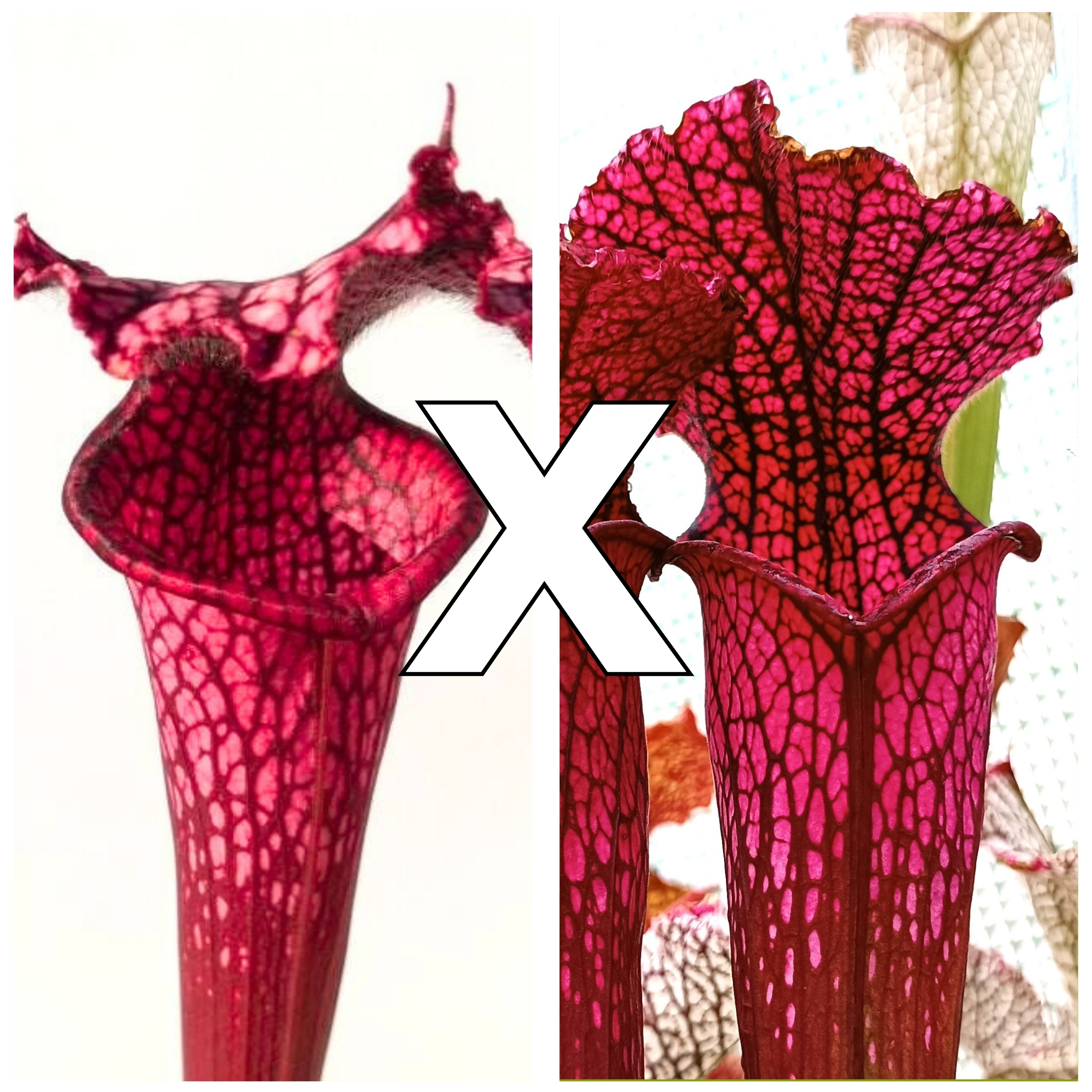 S. leucophylla (“burgundy”, L57 MK x red, L38c MSr) è un incrocio tra cloni estremamente rossi della Sarracenia a foglia bianca. In entrambi i genitori il corpo dell’ascidio è rosso, le fenestrature vanno dal rosa shocking al rosso tenue e le venature arrivano quasi al nero sulla gola. La progenie non può che essere spettacolare.