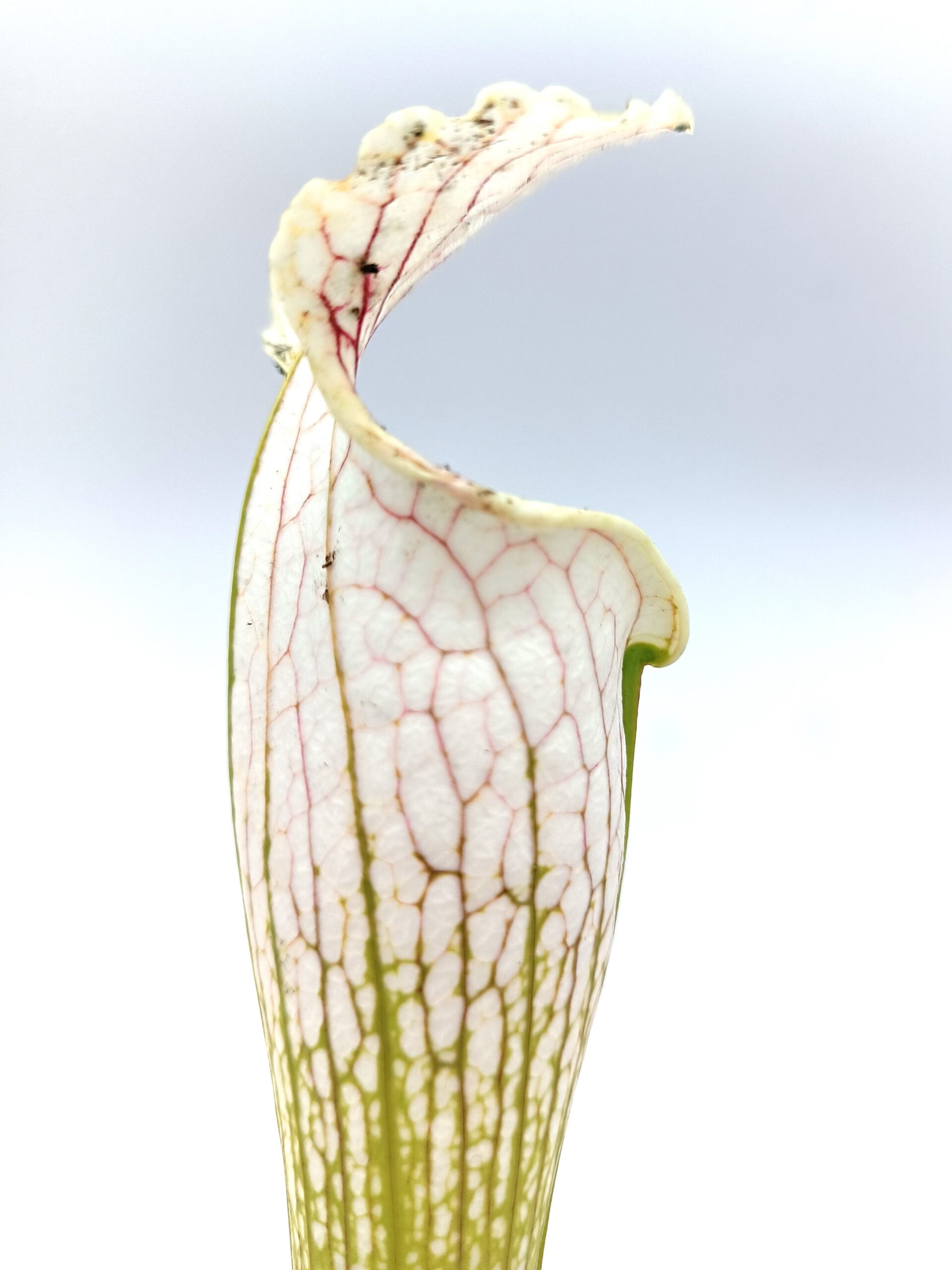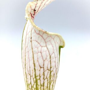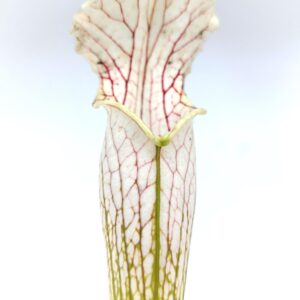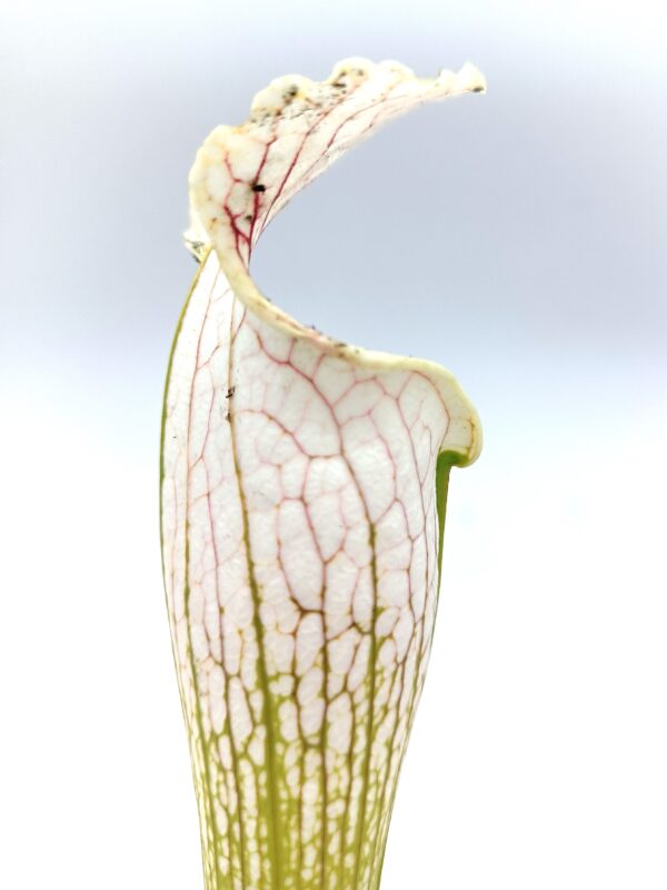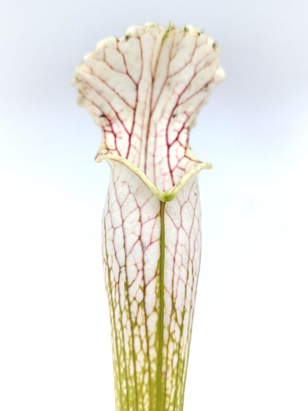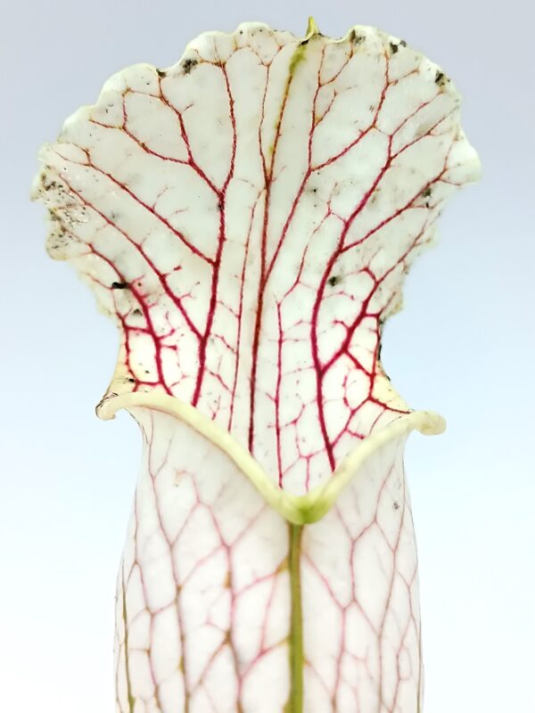 Questo clone in particolare rende piuttosto evidente l’antica introgressione con Sarracenia alata che probabilmente ha dato vita all’intera cultivar, in quanto presenta chiaramente la colorazione bianchissima di un’ottima S. leucophylla, ma ha la forma esatta di una S. alata (fatta eccezione per alcune ondulature del cappello).