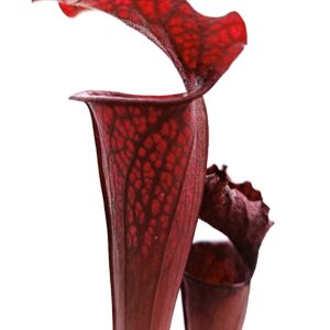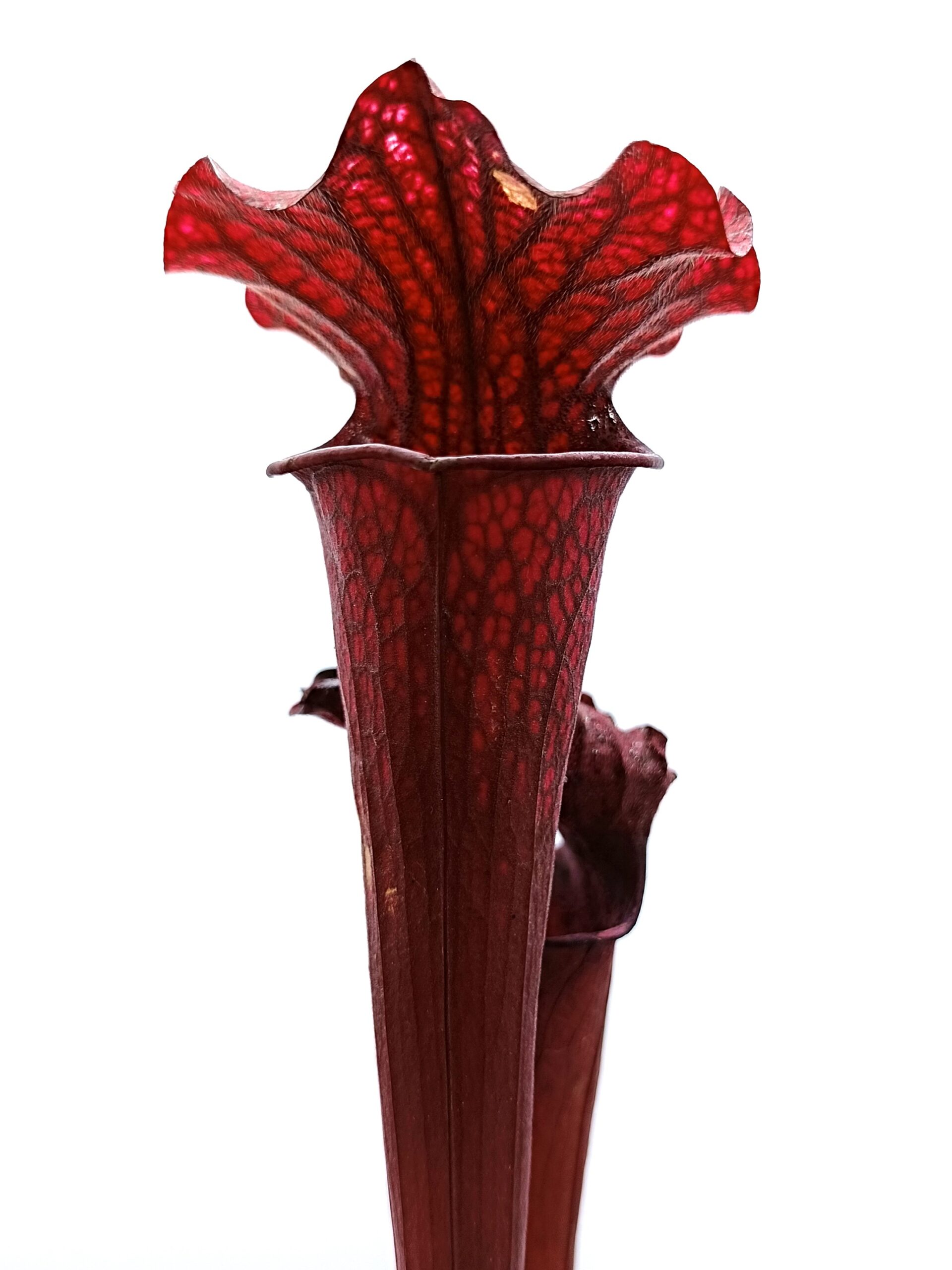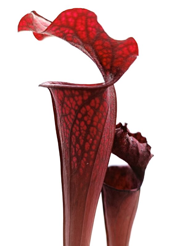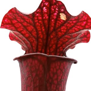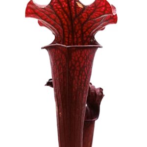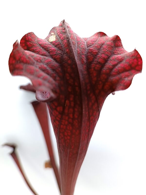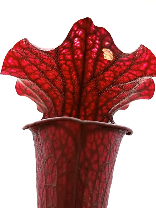 Sarracenia leucophylla (SL94 AC) x (x soperi, IPX110 AS), clone B è un ibrido complesso che coinvolge 3 specie: S. leucophylla, S. flava e S. alata. Entrambi i genitori sono cloni davvero notevoli, e questo esemplare è spettacolare: colorazione rossa scura su tutto l’ascidio con venature ancora più scure (tendenti al nero) ed areolature più chiare. Anche le dimensioni non sono affatto male!