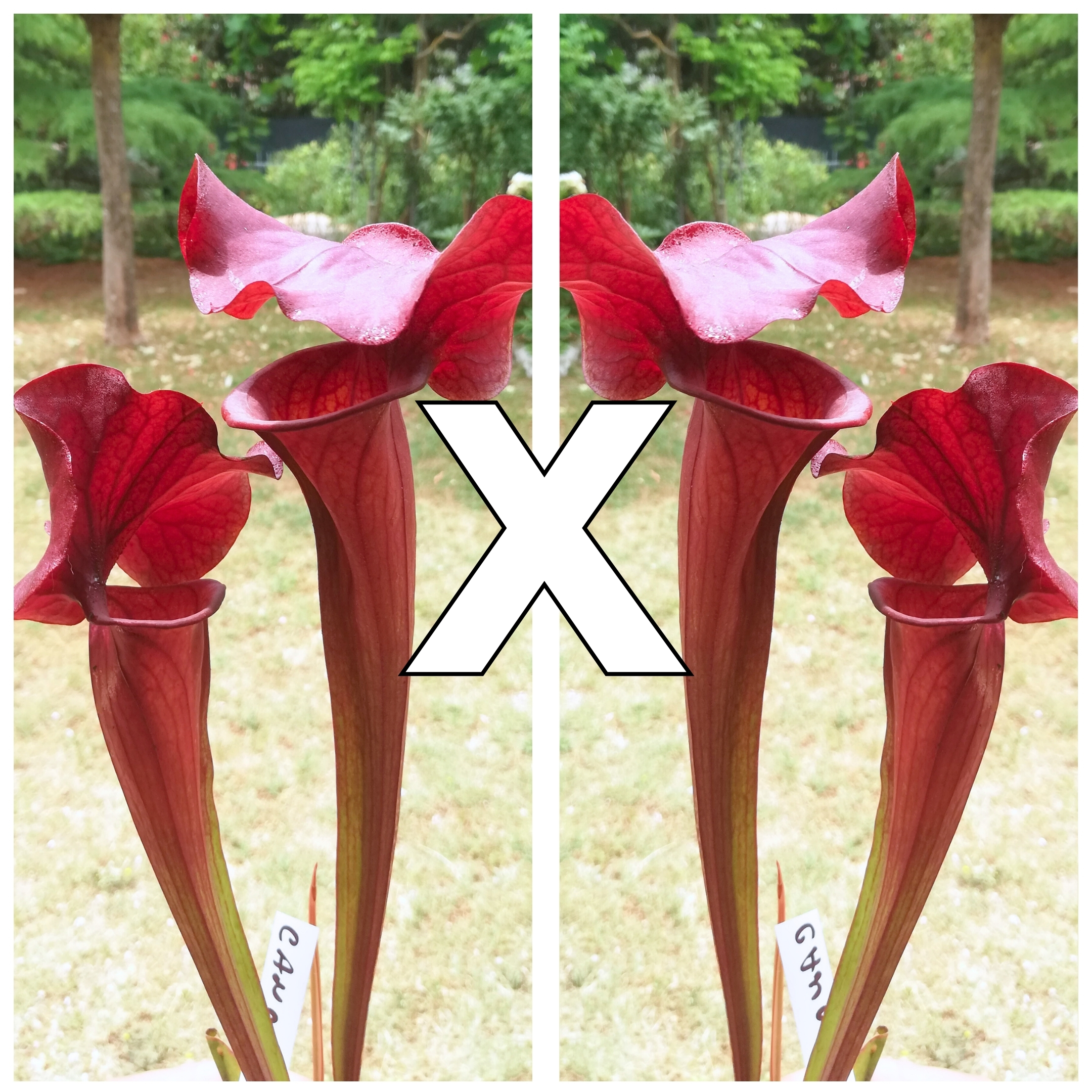 Questi esemplari derivano dall’autoimpollinazione di Sarracenia (x ‘Cancan’), una piccola cultivar di Miroslav Srba con colorazione eccezionalmente intensa, completamente rossa, e cappello molto sviluppato e irregolare.