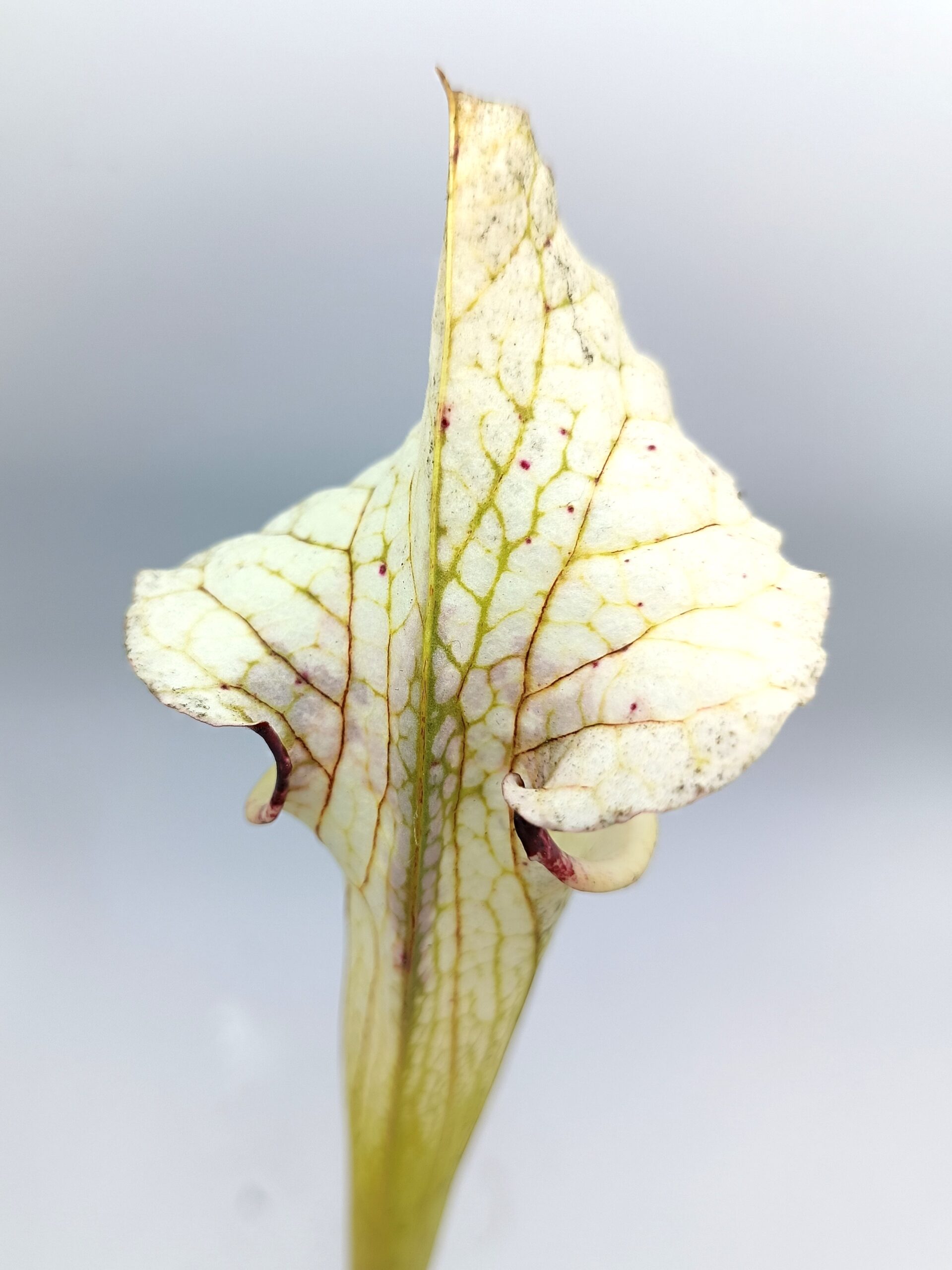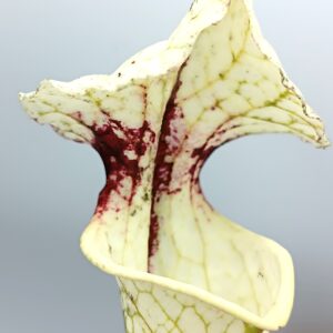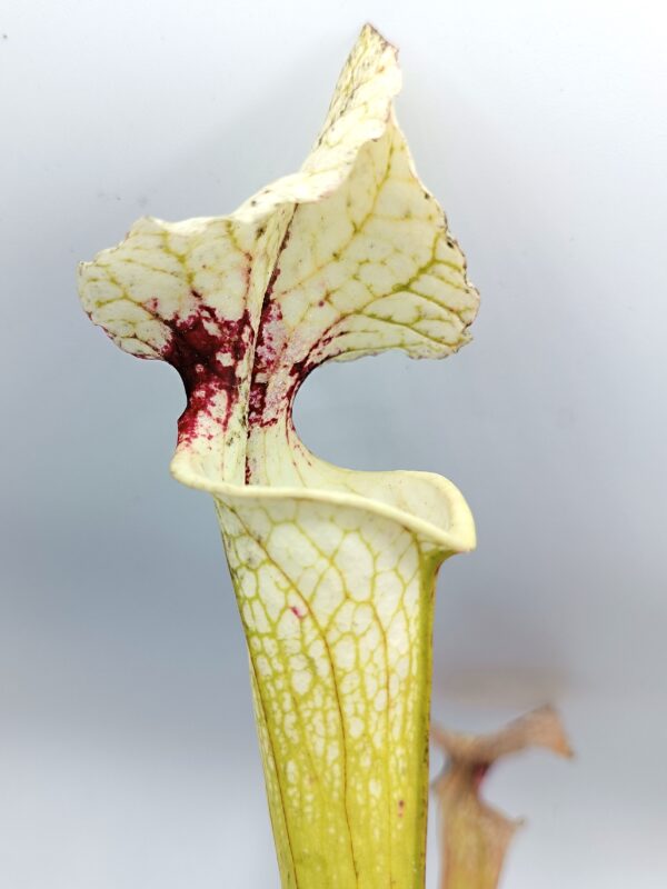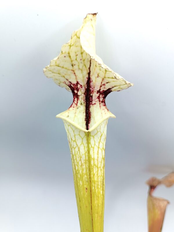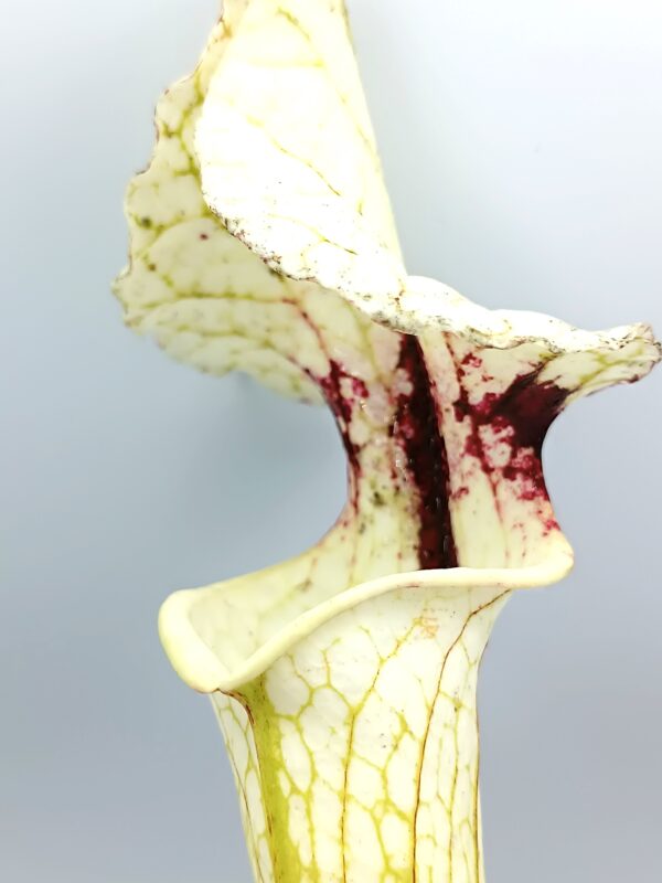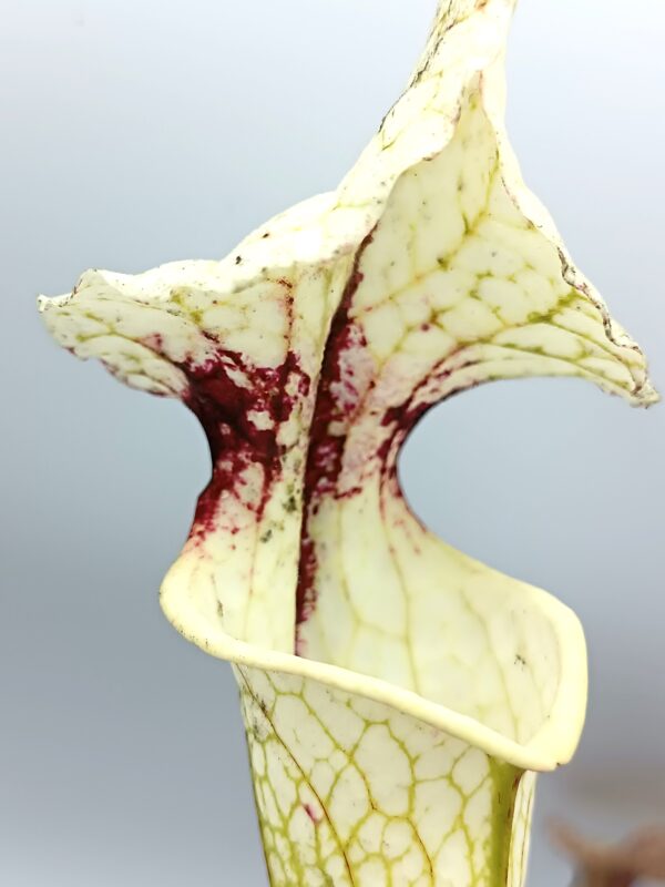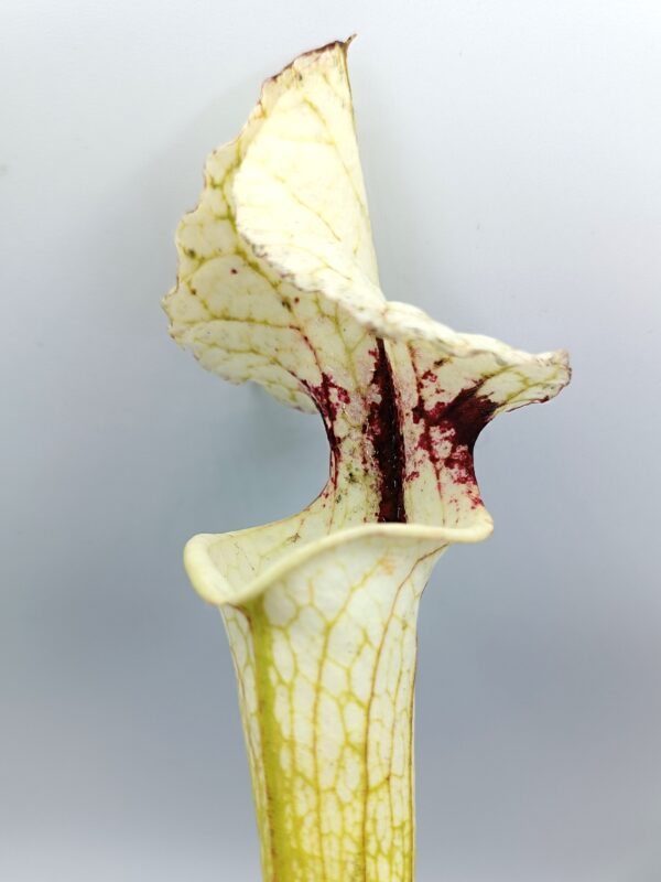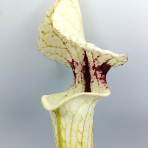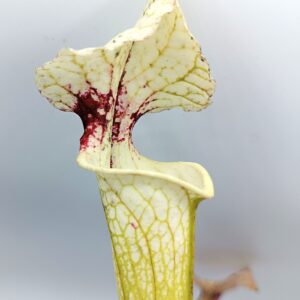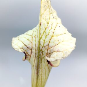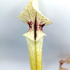 Questo esemplare in realtà non assomiglia ai genitori, ma è a dir poco spettacolare, con il suo colore candido macchiato sulla gola da un viola intenso, ed un opercolo molto sviluppato che svetta verso la luce. Ricorda in qualche modo Sarracenia ‘Legacy’, ma è più elegante.