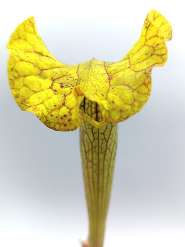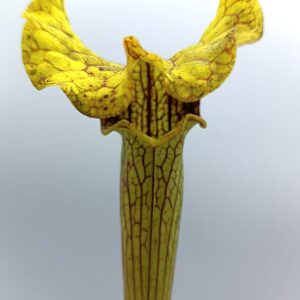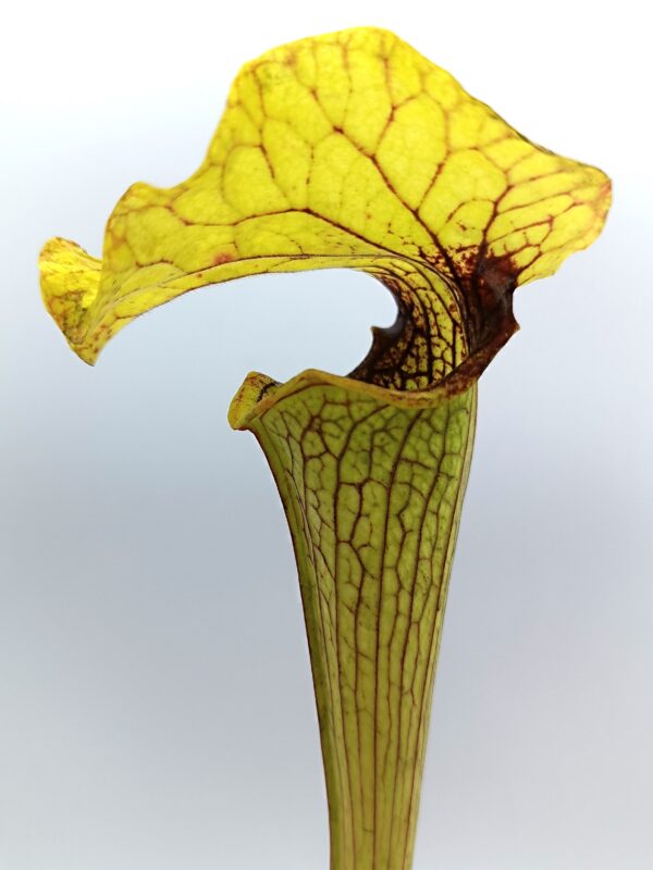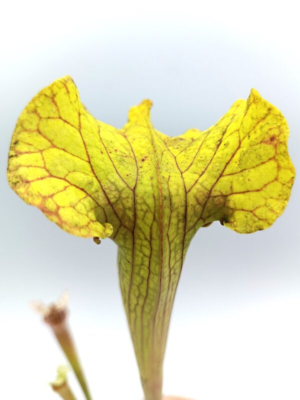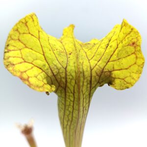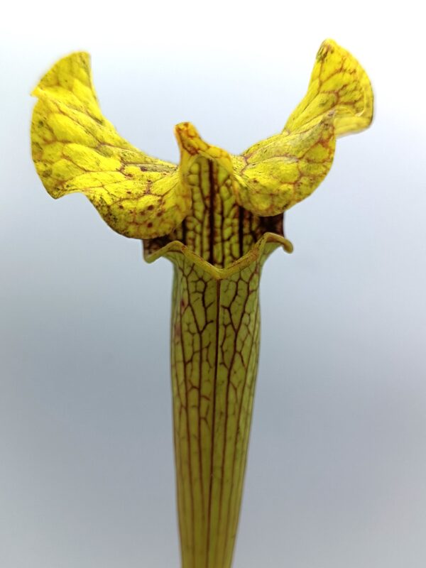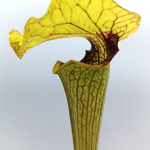 Sarracenia (x moorei “pinkish top”) x (x “camisole”), clone F è un ibrido che non ha praticamente nulla a che fare, nell’aspetto, con le piante genitrici da cui deriva. Risulta infatti simile a Sarracenia x “glider”, quindi una piccola simil-flava con opercolo gigante. In questo caso però quest’ultimo è elegantemente piegato in avanti, come in S. x “camisole”, e lievemente ondulato. La colorazione del cappello è verde acida, mentre sull’ascidio sono presenti delle leggerissime areolature sfumate di bianco.