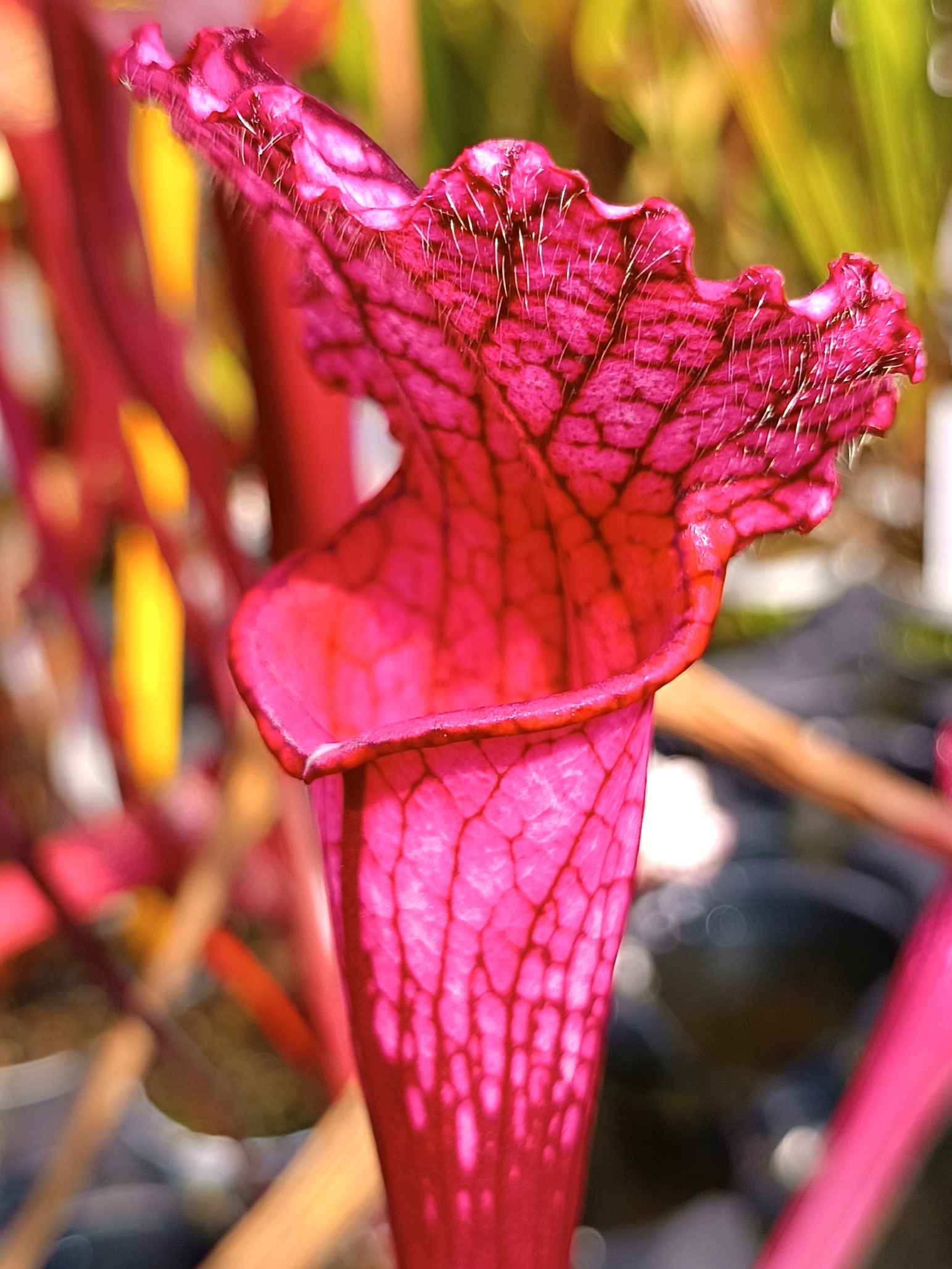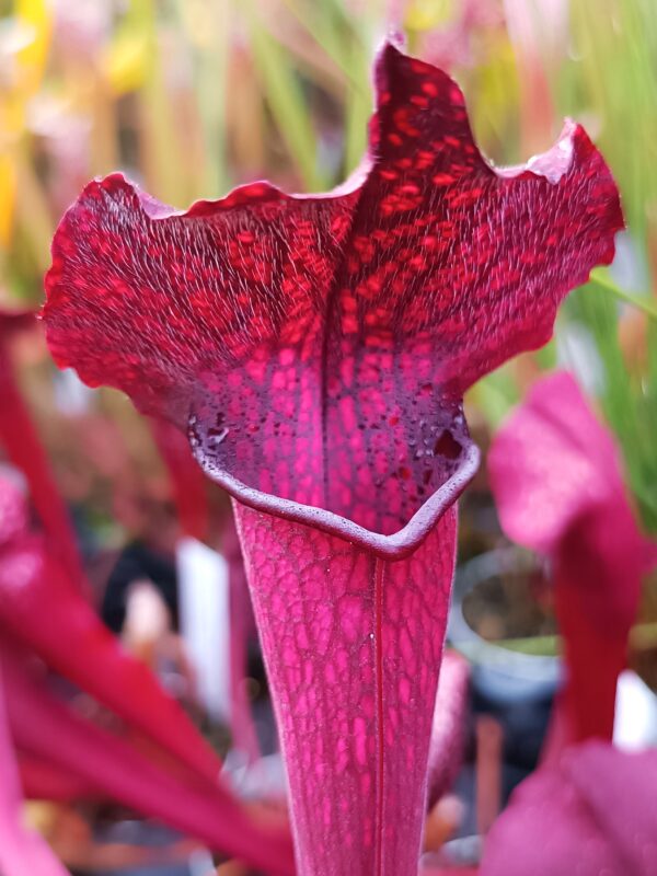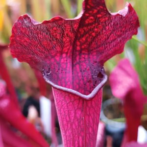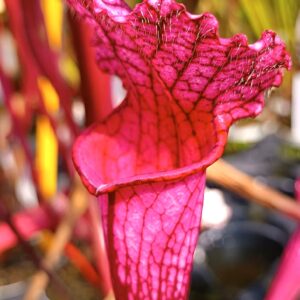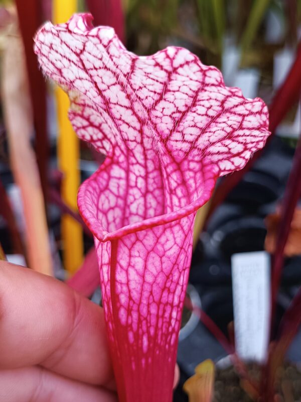 Sarracenia (x “pink thing”) x alata var. nigropurpurea (A60 MK) è un ibrido complesso con colori che vanno dal bianco, al rosa, al porpora. La colorazione è molto variabile sia tra un esemplare e l’altro che nelle diverse stagioni sullo stesso esemplare. I colori più marcati e le dimensioni maggiori si hanno in autunno.